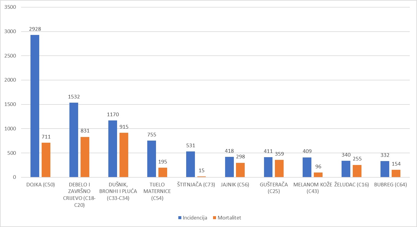 Najčešća sijela raka u žena u 2021. godini, izvor: HZJZ.